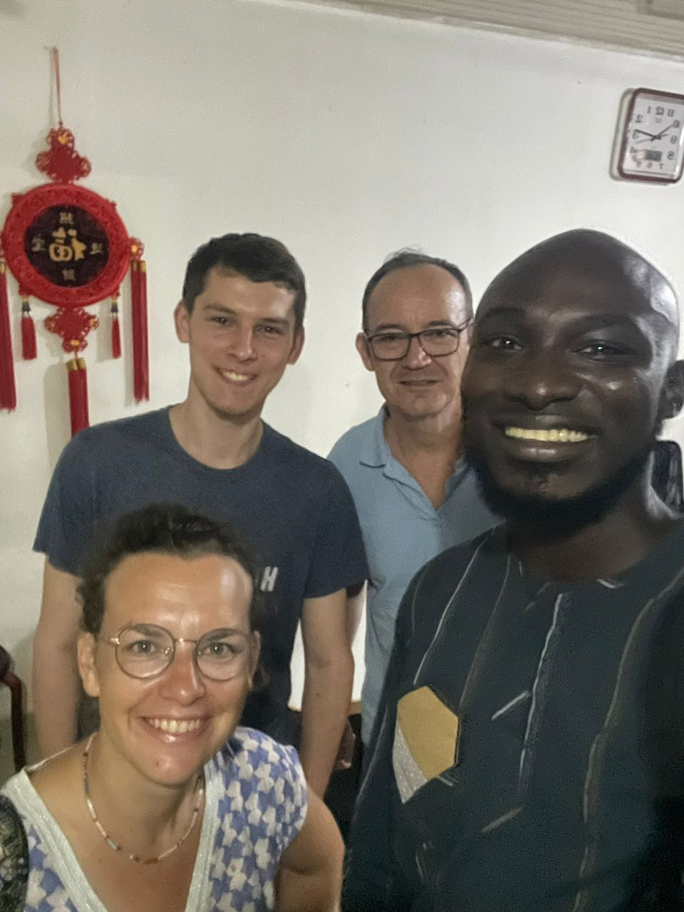 13 juin 2025 - Guinée - Petite réunion de l’Amicale Guinée, pour accueillir Charles, stagiaire 3A en bureau d’études agro, p113 avec Jacques Hervé p79, Mamadou Yatassaye p103 et Marine Rétif p96. Manquait juste 3 membres : Djenaba, la soeur de Mamadou, Pauline Cueto et Anne-Charlotte Coutherut qui constituent les membres permanents de cette Amicale. J’ai trouvé cela émouvant quand Charles nous a expliqué qu’il prenait l’avion pour la première fois de sa vie, et ce, pour venir jusqu’en Guinée. Ahhh l’Istom… Il a déjà appris : les taxis moto, les projets e développement à l’arrêt, les distributeurs de banque qui ne peuvent pas te donner plus de 80 EUR par retrait, les frais de 7 EUR/retrait, la pluie qui mouille vraiment, le riz sauce feuilles… et qui sait ce qui l’attend encore…