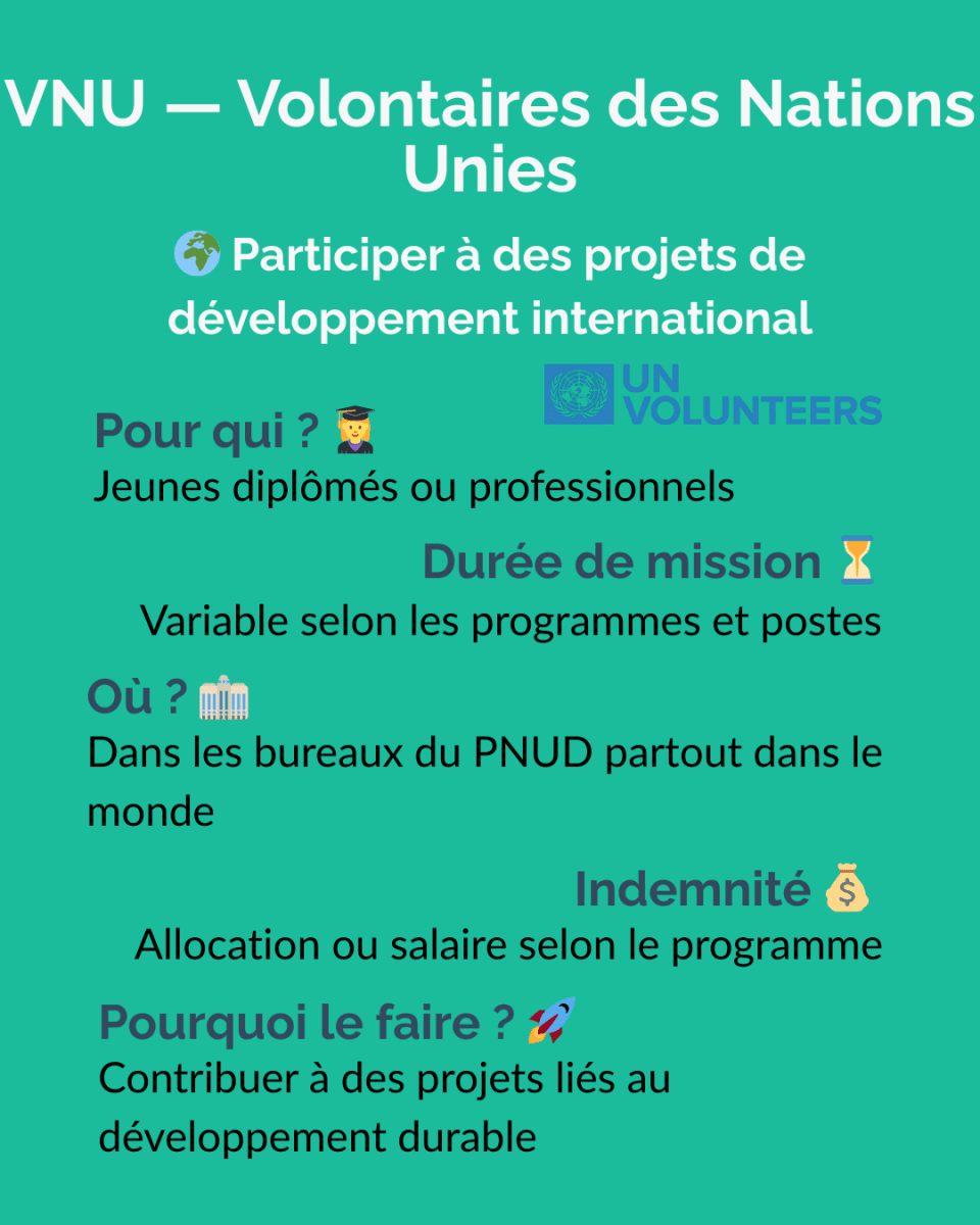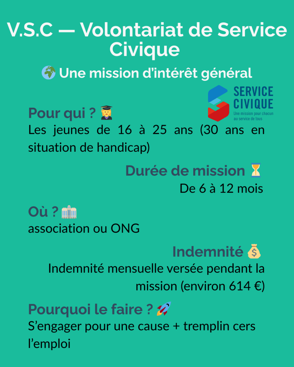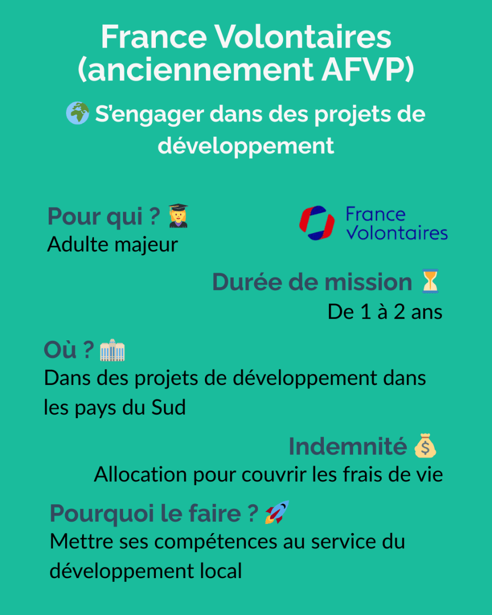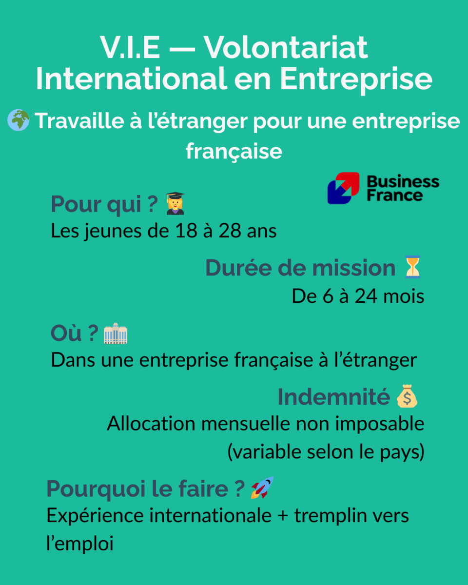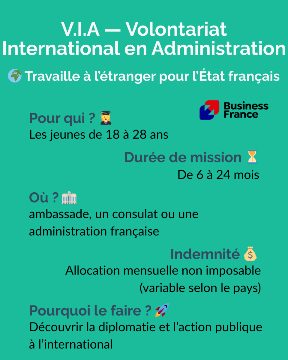 V.I.E — Volontariat International en EntrepriseLe V.I.E est un dispositif géré par Business France permettant à des jeunes de 18 à 28 ans d’effectuer une mission professionnelle à l’étranger pour une entreprise française.✔️ ObjectifsReprésenter une entreprise française à l’étranger.Réaliser des missions à forte valeur ajoutée (business dev, ingénierie, IT, supply chain, finance, etc.).Accélérer son début de carrière dans un contexte international.✔️ FonctionnementDurée : 6 à 24 mois (renouvelable une fois).Contrat public, mais mission dans une entreprise privée.Statut assimilé fonctionnaire, pas un contrat de travail classique.✔️ AvantagesIndemnité mensuelle exonérée d’impôts, variable selon le pays (souvent attractive).Couverture sociale complète (sécurité sociale, prévoyance).Aucun coût pour le volontaire (visa, voyage, assurance pris en charge).Tremplin vers un CDI ou une carrière internationale.✔️ Conditions pour candidaterAvoir entre 18 et 28 ans.Être de nationalité française ou européenne.Être en règle avec ses obligations militaires.V.I.A — Volontariat International en AdministrationLe V.I.A est un dispositif géré par Business France permettant à des jeunes de 18 à 28 ans d’effectuer une mission professionnelle à l’étranger au sein d’une administration française. ✔️ ObjectifsReprésenter l’État français et participer à l’action publique à l’international.Contribuer à des missions dans les domaines diplomatique, économique, culturel ou administratif.Acquérir une première expérience professionnelle dans un environnement international et institutionnel.✔️ FonctionnementDurée : 6 à 24 mois (renouvelable une fois).Mission réalisée dans une administration française à l’étranger.Postes possibles dans une ambassade, un consulat, un service économique ou un institut culturel.Statut public de volontaire (ni fonctionnaire ni salarié classique).✔️ AvantagesIndemnité mensuelle exonérée d’impôts, variable selon le paysCouverture sociale complète (sécurité sociale, assurance, prévoyance).Frais liés à la mission souvent pris en charge (voyage, visa, assurance).Expérience valorisée pour une carrière dans la diplomatie, les organisations internationales ou la fonction publique.✔️ Conditions pour candidaterAvoir entre 18 et 28 ans.Être de nationalité française ou ressortissant de l’Espace économique européen.Être en règle avec ses obligations militaires ou de service national.Avoir un profil correspondant aux besoins de l’administration (souvent niveau licence à master selon les postes).V.S.I — Volontariat de Solidarité InternationaleLe V.S.I est un dispositif permettant à des personnes majeures de s’engager dans une mission de solidarité à l’étranger au sein d’une organisation humanitaire ou de développement.Il est encadré par la loi française et les missions sont réalisées via des ONG agréées par l’État, notamment par le Ministère de l'Europe et des Affaires étrangères.✔️ ObjectifsParticiper à des projets de développement et de solidarité internationale.Soutenir des actions dans des domaines comme l’éducation, la santé, l’environnement, l’agriculture, l’action sociale ou le développement local.Mettre ses compétences professionnelles au service de projets à impact social.✔️ FonctionnementDurée : 12 à 24 mois (renouvelable dans certaines limites).Mission réalisée via une ONG ou association agréée par l’État.Intervention dans des projets de coopération et d’aide au développement.Statut de volontaire, différent d’un contrat de travail classique.✔️ AvantagesIndemnité mensuelle destinée à couvrir les frais de vie sur place.Couverture sociale complète (santé, rapatriement, prévoyance).Frais liés à la mission généralement pris en charge (transport, visa, assurance).Expérience humaine et professionnelle forte dans le domaine de la solidarité internationale.✔️ Conditions pour candidaterÊtre majeur (pas de limite d’âge maximale).Être ressortissant de l’Union européenne ou résider légalement en France.Avoir les compétences ou l’expérience nécessaires pour la mission.S’engager auprès d’une organisation agréée de solidarité internationale.V.S.C — Volontariat de Service CiviqueLe Volontariat de Service Civique (VSC) est une forme spécifique du Service Civique, souvent utilisée dans les ministères, établissements publics ou associations agréées.✔️ ObjectifsS’engager au service de l’intérêt général : SolidaritéÉducationEnvironnementSantéCultureSécurité civilePrévention/exclusion, etc.✔️ FonctionnementDurée : 6 à 12 mois.Engagement volontaire, non professionnel.Le volontaire n’est ni stagiaire, ni salarié.✔️ AvantagesIndemnité mensuelle (614 € net).Formation civique et citoyenne.Accompagnement par un tuteur.Aucun diplôme requis : accessible à tous.✔️ Conditions pour candidaterAvoir entre 16 et 25 ans, ou jusqu’à 30 ans pour les personnes en situation de handicap.Résider légalement en France.Motivation personnelle, pas de compétence particulière exigée.France Volontaire (Anciennement AFVP) Un dispositif historique géré par France Volontaire, orienté coopération internationale et immersion longue avec un impact local.✔️ ObjectifsPermettre aux jeunes Français de s’engager dans la coopération internationale, principalement dans les pays du Sud.Soutenir des projets de développement économique, social et humain.Favoriser le transfert de compétences vers les acteurs locaux (ONG, collectivités, associations).✔️ FonctionnementCréée en 1963, puis transformée en France Volontaires en 2009.Missions généralement longues, souvent 24 mois, au sein d’associations, ONG, institutions locales.France Volontaires coordonne aujourd’hui différents types de volontariats d’échange et de solidarité 